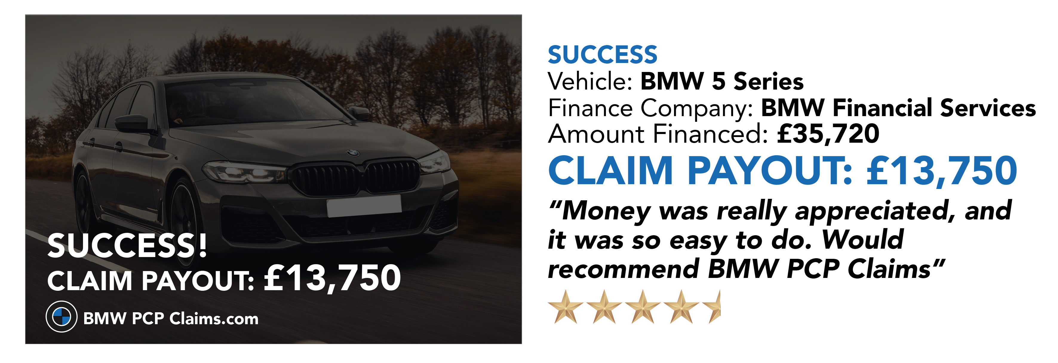 This depends on the amount that you financed and the APR, generally the higher the amount financed the larger the amount of claim. Whether you had a PCP or Hire Purchase, our average pay-out on BMW’s is £13,500. Want to know how much your claim could be worth, Hit the button below and get a valuation in less than 10 seconds.